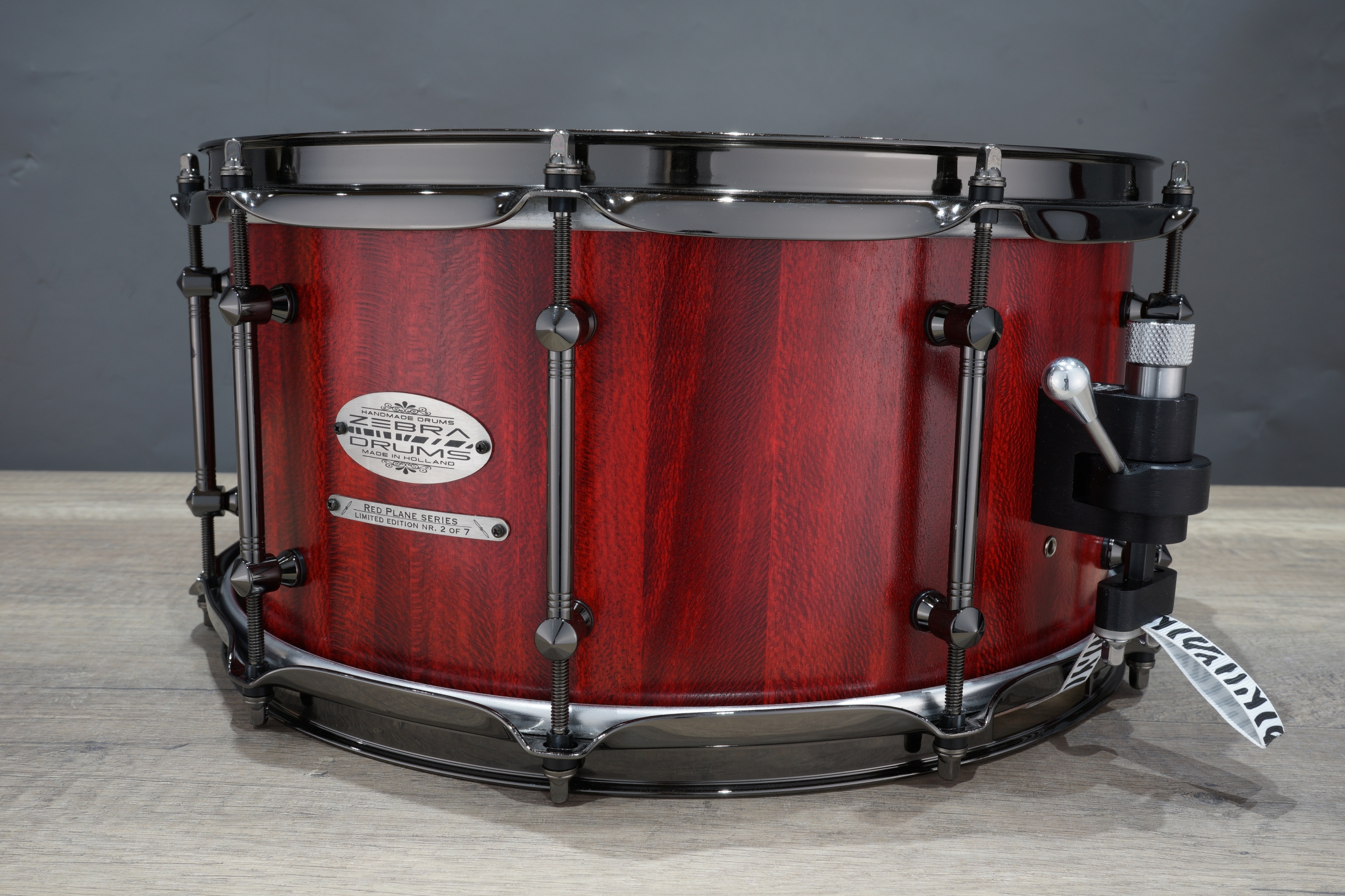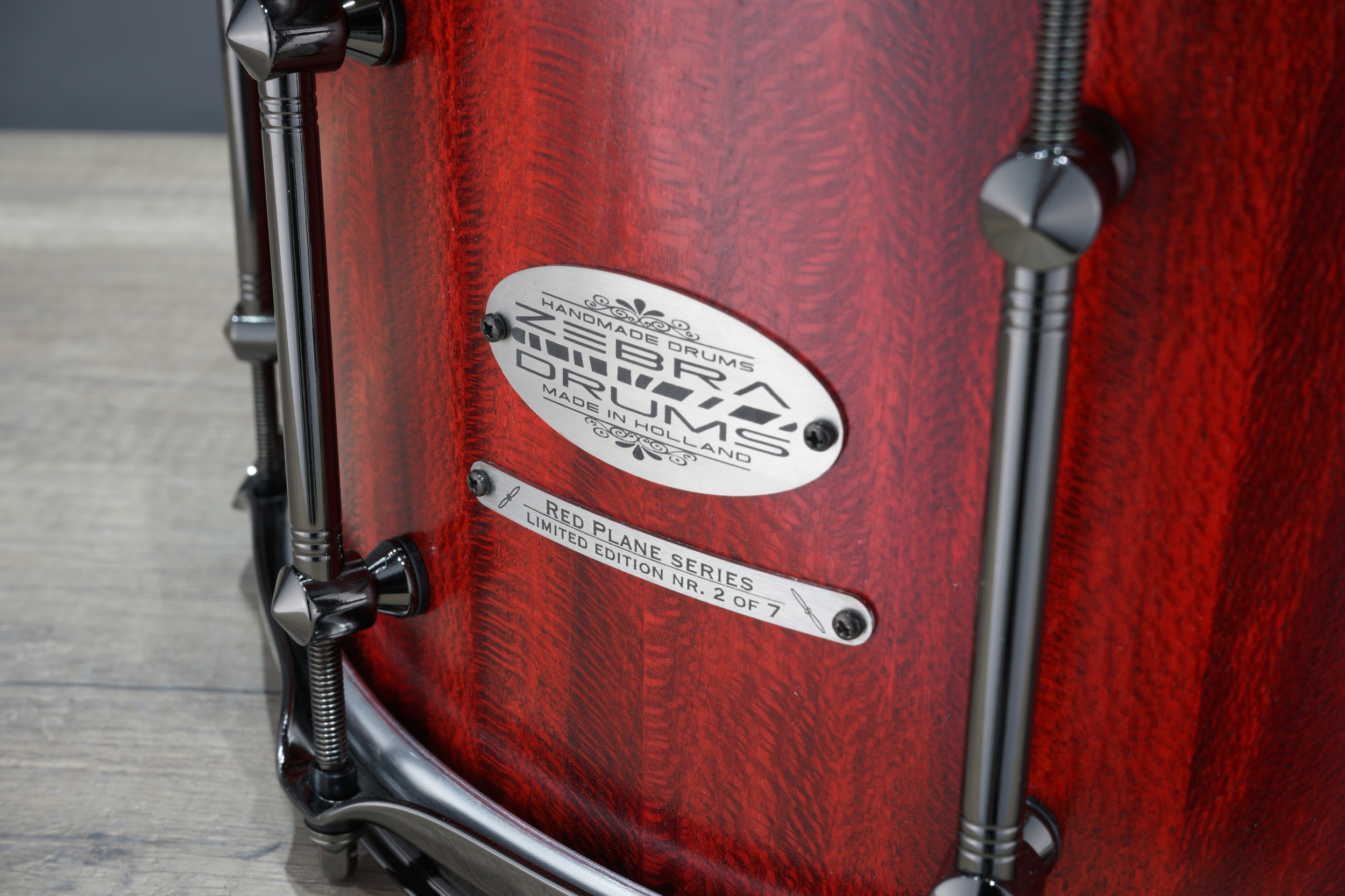 This is a limited edition series since the lug used on these drums is no longer being made and I have some left in stock. Each drum even has it’s own number featured on an additional custom badge, ranging from 1 to 7, depending on when it’s made. With the all black hardware and the Flaming Red stain these snares look the business. The series is limited to 7 drums in total: 4 snares of the 14” x 6” and 3 snares of the 14” x 7”. So get yours before they are gone!