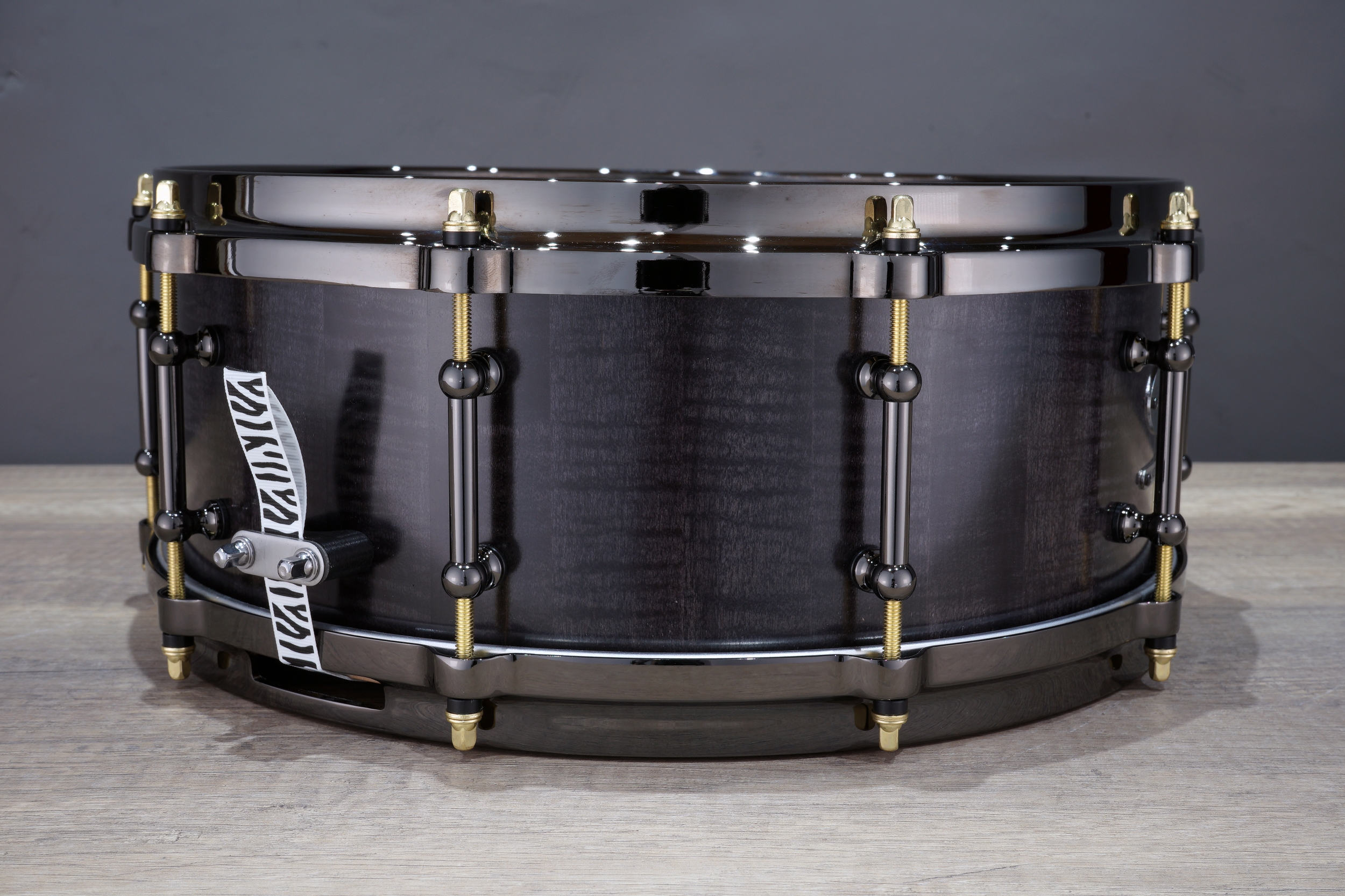 The shell is made from solid Fiddleback Maple/Tiger Maple in a fingerjointed stave construction and has a thickness of 12 mm. With these specs this drum has enough power to do exactly that. The shell is finished in a beautiful Translucent Black stain finish. It’s fitted with all black hardware, including die-cast hoops, brass plated tension rods, Zebra straps and an Evans black head (batterside) to complete the look. It’s fitted with Thread Locks all round so it will not detune while playing.